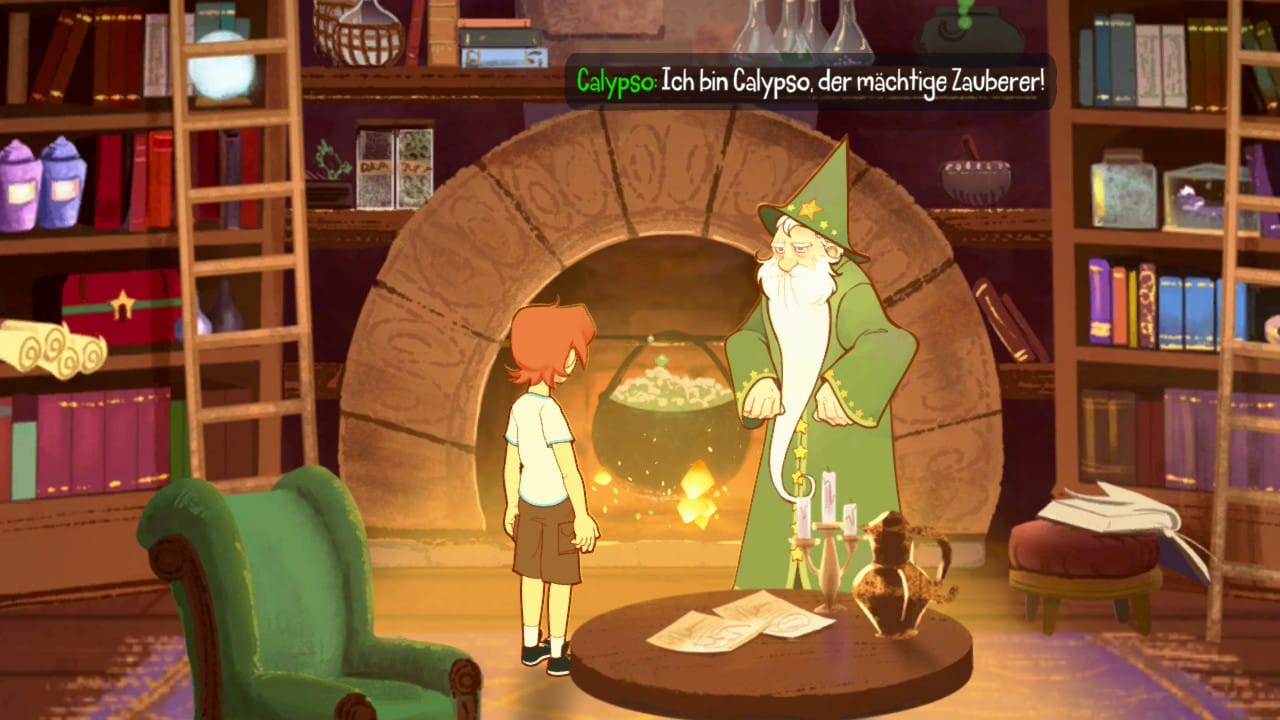 Nach ersten Schritten durch ein ominöses Höhlensystem stoßen wir auf das Haus des greisen Zauberers Calypso, der Simon einerseits kundtut, wo er sich grad befindet, andererseits den Umstand, dass dieser Teil einer uralten Prophezeiung des geheimnisumwitterten ersten Zauberers zu sein scheint. Konkret soll Simon zwei magische Folianten auftreiben – klar, nichts leichter als das. Diese Folianten gelten dann auch als unser wesentliches McGuffin, um die Handlung voranzutreiben. Denn nicht nur bewahren sie das Gleichgewicht der magischen Welt, für Simon sind sie auch ein Instrument, um wieder zurück in sein altes Leben zu finden.