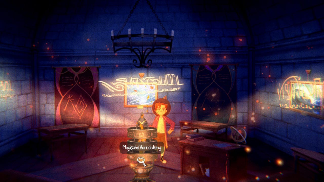 Nun aber zur Schwierigkeit: Nicht selten sind die Lösungswege ein wenig krude geraten und erfordern eine sehr konkrete Vorgehensweise, welche die Entwickler*innen hier vorgesehen haben: Ein Beispiel gefällig? Kurz bevor wir den Feuerzauber erlernen, aktivieren wir eine ominöse Apparatur, die ominöse Schriftzeichen an die Wände wirft. „Aha!“ denkt sich der oder die findige Abenteurer*in – es ist doch sonnenklar, dass wir hier das Wörterbuch im Inventar auf die Schriftzeichen anwenden müssen. Das bekommen wir aber mit dem Kommentar quittiert, dass das so nicht funktioniere. Die Lösung ist nun also, dass wir das Wörterbuch erst auf Simon selbst anwenden, der das Lesen der Zauberrunen erlernt und fortan das Geschriebene entziffern kann. Das Spiel nimmt aber kaum an die Hand, zeigt sich wenig flexibel und liefert keine Hinweise, in welche Richtung die Spieler*innenstrategie gehen könnte. Mit der Anwendung schwarzer bzw. weißer Magie kommen noch ein paar vertracktere Kopfnüsse hinzu, die nicht immer ganz logisch aufgebaut sind.